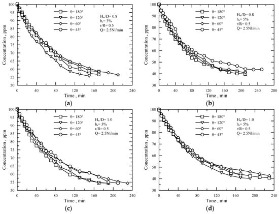 Figure 9 shows the experimental results of the concentration of thymol in water as a function of time for different ladle aspect ratios, slag thicknesses, and separation angles. The ladle aspect ratio is the ratio of the height of the liquid steel to the ladle diameter. The slag thickness is defined as the height of slag with respect to the height of the liquid steel, as a percentage. The results are valid for constant conditions of the gas flow rate (2.5 NL/min) and the porous plug radial position (r/R = 0.5). It can be observed that the end time is different for different experiments and the reason is that each experiment was stopped when it reached steady-state conditions; therefore, there was no need to repeat a final constant concentration.