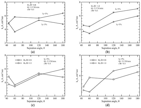 Effect of the separation angle for different slag thicknesses and ladle aspect ratios on the volumetric mass transfer coefficient. (a) Hw/D = 0.8, hs = 3 and 5%, (b) Hw/D = 1.0, hs = 3 and 5%, (c) hs = 3%, Hw/D = 0.8 and 1.0, (d) hs = 5%, Hw/D = 0.8 and 1.0.
