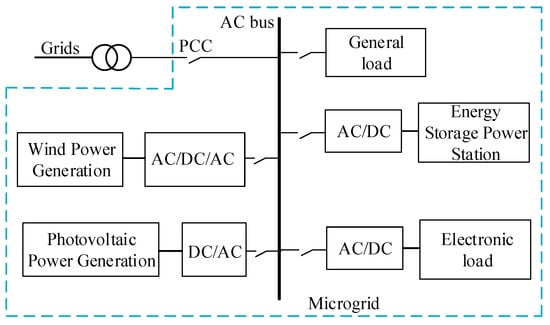 As shown in Figure 1, the microgrid can operate in both grid-connected and off-grid modes, depending on whether the PCC at the common connection point is open or closed [11]. When connected to the LV distribution network through the PCC, the microgrid operates in grid-connected mode. This configuration enables bidirectional power transmission and interaction with the LV distribution network, depending on its energy supply status. Conversely, when the PCC is disconnected, the microgrid operates in off-grid mode. In this state, the converter system generates power from its distributed energy sources and supplies it to internal loads through the microgrid’s power transmission lines, thereby achieving self-sufficiency in power supply.