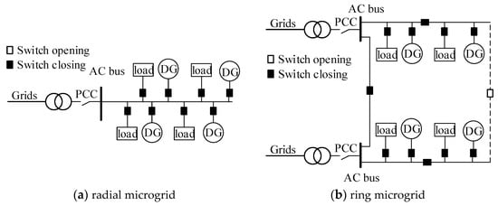 Currently, AC microgrid topologies primarily consist of two main configurations: radial microgrids and ring microgrids. The radial microgrid facilitates distributed energy pooling and load power supply through a single AC bus that radiates outward. Its specific structure is illustrated in Figure 1. Typically, a radial microgrid consists of a public AC bus, distributed energy sources, electrical loads, inverters, and transmission lines [10]. As illustrated in the figure, the AC bus of the microgrid connects three feeders to the low-voltage (LV) distribution network. The connection between the AC bus and the LV distribution network is established through the point of common coupling (PCC). The distributed energy sources consist of photovoltaic cells, energy storage batteries, wind turbines, micro gas turbines, and others, which are connected to the three feeders through power electronic converters like inverters based on their specific distribution. A simplified structure of a radial microgrid is illustrated in Figure 2a. This configuration is vulnerable to internal disturbances and lacks interoperability with other power systems. To enhance the reliability of the power supply, a ring microgrid is a more dependable option. As illustrated in Figure 2b, the ring microgrid features several independent common AC buses that are interconnected via switches to facilitate power sharing among various microgrids. Furthermore, ring microgrids are typically linked to different LV distribution networks through multiple common coupling points. As a result, the ring microgrid experiences a shorter average sustained outage time and has a greater capacity to integrate conventional power from distributed generators (DGs).