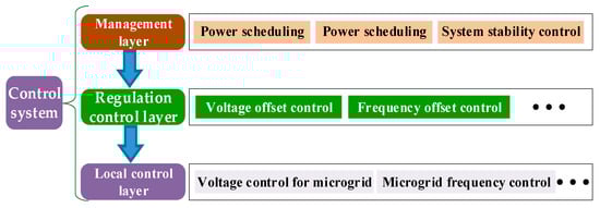 As illustrated in Figure 3, the dual-mode operation of the microgrid—both on-grid and off-grid—depends not only on the appropriate hardware configuration but also on the control system. The current composition of the control system in microgrids typically consists of three layers: the dispatch management layer, the regulation control layer, and the local control layer [12]. The dispatch management layer oversees power scheduling within the microgrid and regulates the power flow between the microgrid and the distribution grid, ensuring stable overall operation as the highest level of control. The regulation control layer focuses on the secondary adjustments of control parameters, such as voltage and frequency offsets for individual grid-connected inverters. Meanwhile, the local control layer is responsible for maintaining stable voltage and frequency within the microgrid by managing local distributed energy resources, including local converters. Effective coordination among these three control levels often requires a dedicated communication network, which can raise the investment costs of the microgrid system.