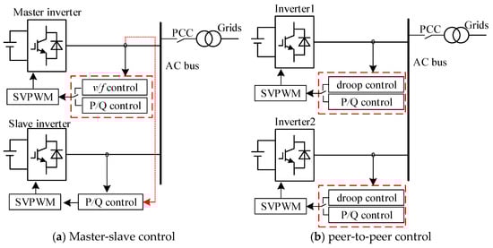 Currently, the two primary control methods for islanded microgrids are hierarchical control and master-slave control, both of which manage the operation of the microgrid through a communication network [14]. Hierarchical control emphasizes optimizing the output of distributed power systems while ensuring efficient and economical operation through comprehensive global power management [15]. However, this method requires frequent information exchange between master and slave controls, which can elevate communication costs and the expenses related to developing the communication infrastructure. The master-slave control structure divides the inverter into master and slave inverters, as illustrated in Figure 4a. When the microgrid operates in off-grid mode, the main controller employs a voltage/frequency (v/f) control strategy to stabilize the system’s bus voltage. The output current from the master inverter is transmitted to the slave inverter, where it serves as a reference for its operation. Therefore, the main inverter is typically configured with a high-capacity power supply to ensure the frequency-voltage stability of the microgrid system. The remaining slave inverters operate in P/Q control mode, following the master inverter. However, when the master inverter stops functioning or fails, the stability of the entire microgrid system faces significant challenges [16]. Additionally, this operational method relies on the existing communication network of the microgrid, which increases the overall construction costs of the system.