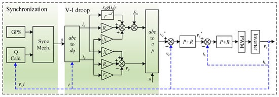 Furthermore, Ref. [62] addresses the challenge of inconsistent line impedance in islanded microgrids, which hinders the dynamic distribution of output power among distributed power inverters based on their capacity. The authors propose a method for identifying microgrid line impedance, building on the satellite synchronous fixed-frequency down-control strategy. This approach facilitates power equalization among distributed power sources through line parameter identification and the design of power equalization controllers. Expanding on this, Ref. [63] introduces a control strategy that integrates satellite synchronous frequency fixing with line impedance identification and its control method diagram is shown in Figure 6. This approach mitigates the effects of voltage phase differences and variations in line impedance on power distribution by utilizing a second pulse signal from GPS to calculate the synchronized phase angle of the converter’s rotating coordinate system. This enables each inverter to generate output voltages with a consistent phase and a frequency of 50 Hz. Furthermore, the authors implement a virtual resistance compensation mechanism within the d-axis control loop to address voltage dips caused by resistance, thereby ensuring balanced power distribution.