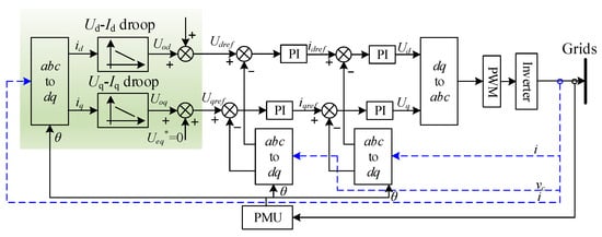 To enhance the stability of synchronous fixed-frequency microgrids during transitions between grid-connected and islanded states, Ref. [66] explores seamless switching technology for these microgrids without inter-device information interaction. The authors employ satellite timing signals to detect the islanding condition and utilize tracking differentiators to achieve phase overshoot-free tracking. This approach ensures a rapid and smooth transition of the microgrid from a grid-connected to an islanded state. Additionally, the authors propose a frequency offset-based method for detecting the grid-connected state, which facilitates synchronous and stable operation of the microgrid during the transition from islanding to grid-connected mode. In addressing the issues of frequency deviation and the inability to accurately allocate power due to the droop control used in microgrid islanding operations, a synchronized fixed-frequency control strategy based on PMUs is proposed in [67]. This method utilizes the second pulse generated by the PMU as the synchronization reference signal for each distributed power inverter, enabling the generation of a uniform real-time rotational phase angle. Using this phase angle, the schedulable distributed power inverters at each node are synchronized to output voltages with a fixed frequency and in phase. Furthermore, the output voltage of the inverters is adjusted quadratically to achieve precise power distribution, taking into account the rated capacity share of each distributed power source. Building on this foundation, a new U/I droop-based control method for full-inverter microgrids is proposed in Reference [68]. The method aims to eliminate errors associated with conventional phase angle measurements by utilizing a synchronized PMU that provides a globally synchronized reference signal. The U/I droop control allows each inverter to operate in voltage control mode, distributing the power of each distributed power inverter in equal proportions. The overall block diagram of the method in Ref. [68] is illustrated in Figure 7. However, none of the previously mentioned methods employed the analytical and modeling techniques described in [69,70] to model the microgrid excess process and analyze the data.