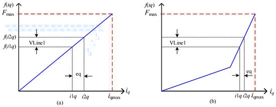 Aiming to address the issue of islanded microgrids that generate minor perturbations during state switching, which can lead to transient oscillations, a study [24] has been developed to enhance the dynamic characteristics of inverter-based microgrids and facilitate smooth transitions between different operational modes. The authors derive an accurate small-signal state-space model of the entire microgrid, incorporating the droop controller, network, and load. They also design the key control parameters of the inverter and determine their optimal ranges through eigenvalue analysis, which significantly influences the damping frequency of the oscillatory component in the transient response. Ref. [44] addresses the slow dynamic characteristics inherent in power droop control methods. The authors of this paper propose a novel control method based on U-I characteristics to enhance the flexibility and dynamic response of distributed inverters. This method implements segmented droop control of the current through the DC and quadrature axis voltage components, resulting in improved dynamic performance and better damping characteristics. The segmented droop control curve from Ref. [44] is illustrated in Figure 8b.
