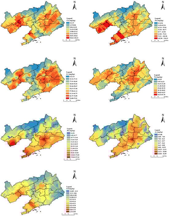 ArcGIS was utilized to perform ordinary kriging interpolation on the metal concentrations at the sampling points, subsequently generating a spatial interpolation diagram (Figure 2). When metals exhibit comparable distributions of concentration, it suggests that they likely share a similar origin. The high concentration of Cr, Ni, and Cu is mostly distributed in the eastern part of Chaoyang City, the western part of Jinzhou, the eastern part of Huludao, the southeastern part of Shenyang City, and the eastern part of Liaoyang City. As and Pb are primarily distributed in the western part of Chaoyang—and Huludao City—and in the middle and eastern parts of Liaoning Province. The concentrations of Pb and As in most sampling sites surpassed the soil background values. The regions with a high concentration of Zn and Cd are principally distributed in Huludao City, west of Jinzhou City, south of Shenyang City, south of Anshan City, and west of Dandong City [31]. Some sampling sites had a high heavy-metals concentration, which exceeded the risk screening value in soil environmental standards. The survey revealed that sampling sites with elevated concentrations of heavy metals were predominantly situated in close proximity to industrial facilities, coal mines, or regions abundant in mining resources. The heavy-metals concentration may be greatly impacted by anthropogenic activities such as industrial activities and mining activities.