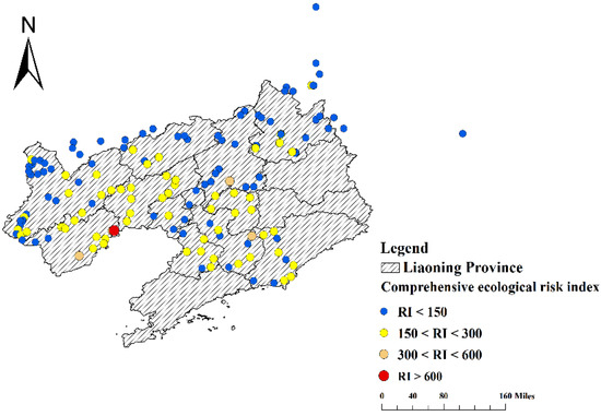 The results of the comprehensive ecological risk index are shown in Figure 4. Severe ecological risk exists in Yingzi Village, Lianshan District, Huludao City. There is a slight ecological risk in the vicinity of Xiaogao Village in Tiexi District, Shenyang City, as well as Qingchengzi Town in Fengcheng City, Anshan City. There is a moderate ecological risk in Jianchang County, Suizhong County, Xingcheng City of Huludao City, Yixian County, and Xihe District of Jinzhou City.