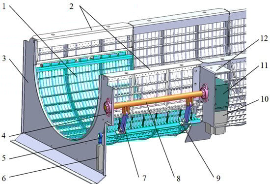 Adjustable threshing concave sieve, (1) adjustable lower threshing screen; (2) fixed upper threshing screen; (3) drum inlet baffle; (4) bearing seat; (5) rod end joint bearing; (6) displacement sensor; (7) connecting arm; (8) rotating shaft; (9) connecting ear; (10) stepper motor; (11) gearbox; (12) mounting bracket.