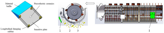 Based on the threshing separation probability model of the axial-flow cylinder, the structure and installation position of the entrainment loss monitoring sensor were designed and determined, as shown in Figure 3. The sensor is located below the rear end of the threshing concave sieve and mounted on the inner wall of the threshing device, avoiding the impact of large amounts of long stalks at the straw discharge outlet. The material baffle is positioned above the sensitive plate to prevent the accumulation of a threshed mixture between the sensitive plate and the inner wall of the threshing device. The minimum distance between the centerline on the sensitive plate and the threshing concave sieve is 58 mm, and the installation angle of the sensor relative to the horizontal plane is 65°. Through previous research team’s calibration experiments on maize threshing impact signals [22], it was determined that bandpass filtering frequency of 14–20 kHz can accurately identify grain kernels.