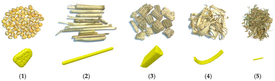 Maize threshing mixture particle models: (1) grain kernels; (2) short stalks; (3) maize cobs; (4) maize leaves; (5) light residue.