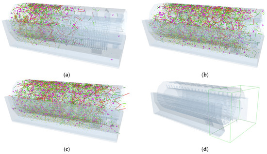 - Calibration of Entrainment Loss Monitoring RatioThe DEM simulation results of the proposed maize threshing device under maximum feed rate and 28 mm threshing clearance conditions are shown in Figure 5. In the simulation diagram, the different colored particles represent different organs of the maize plant: yellow represents maize kernels, green represents short stalks, red represents long stalks, cyan represents light contaminants, magenta represents maize cobs, and light green represents maize leaves.