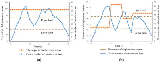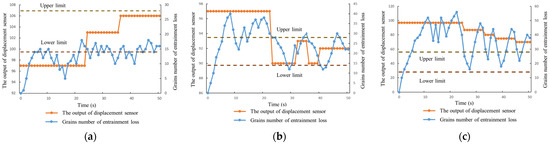 From the grain loss trend line in Figure 8a, when the forward speed was maintained at 0.5 m/s, the entrainment loss grain count stabilized between 10 and 15 g/s during the first 20 s. After 20 s, when the entrainment loss grain count fell below the ideal value of 14, the displacement output began to increase, and the threshing gap decreased. The loss value remained within the ideal range for the majority of the time, indicating low entrainment loss during low-speed operation [32,33]. Therefore, automatic threshing gap control is unnecessary at lower forward speeds.