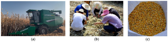 Maize is an important crop that can be processed into various food and industrial products such as starch, sweeteners, beverages, glue, industrial alcohol, and fuel ethanol [1,2,3]. In 2023, China’s maize planting area was approximately 44.22 million hectares, making it one of the world’s largest maize producers and consumers [4,5,6]. Maize harvesting is typically conducted when the grain moisture content is between 20 and 35%, followed by extended drying until the moisture content reaches around 15% before threshing with small threshers [7,8]. This method has disadvantages, including long processing cycles, high labor intensity, and high operating costs, which cannot meet modern maize production requirements [9,10]. Therefore, China’s maize harvesting operations are gradually transitioning to direct grain harvesting, which is significant for shortening harvest cycles, saving production costs, improving operational efficiency, and promoting agricultural mechanization.