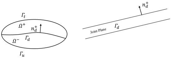 As indicated in Figure 1, the whole domain was divided into two parts, , and whole domain is bounded by . The normal vector indicates the direction of relative to the joint plane.