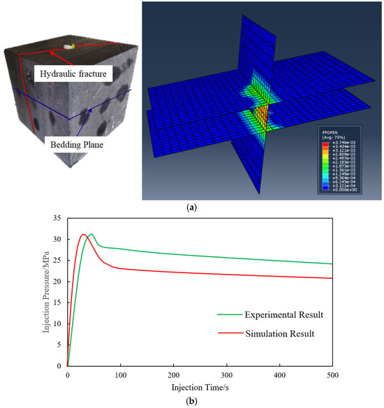 To further understand the hydraulic fracture propagation when it came across the bedding plane in shale formation, a 3D numerical model was established which considered the leak-off of the fracturing fluid and deformation of fracture surface, and the basic parameters of the proposed model are shown in Table 1. To improve the accuracy of the proposed model, the published experimental results were used to verify the numerical simulation. From the comparison, it was found that one main fracture was created which has three branch fractures, and the simulations also had the same fracture geometry (Figure 2a). For the breakdown pressure and extension pressure, the experiment indicated that the breakdown pressure and extension pressure were 31.4 MPa and 25.3 MPa, and the breakdown pressure and extension pressure were 30.7 MPa and 24.8 MPa (Figure 2b). The main reason for this phenomenon was that the flow resistance resulted in a higher the breakdown pressure and extension pressure than that of the simulation. The error of the breakdown pressure and extension pressure were 2.23% and 1.78%, and the accuracy of the proposed model was verified.