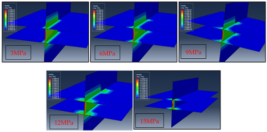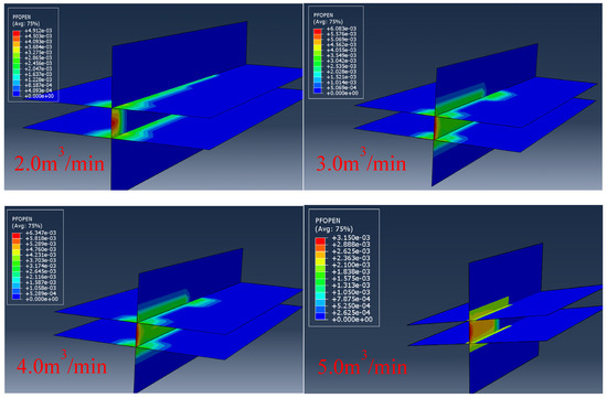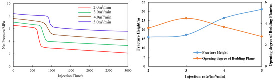 To understand the effect of the injection rate on fracture propagation, an injection rate of 2.0 m3/min, 3.0 m3/min, 4.0 m3/min, and 5.0 m3/min was simulated, and other parameters were as shown in Table 1. From the simulation, it was found that the hydraulic fracture crossed the bedding plane when the injection rate was 4.0 m3/min and 5.0 m3/min, while it was arrested by the bedding plane when the injection rate was 2.0 m3/min and 3.0 m3/min. When the injection rate was 2.0 m3/min, the opening degree of the bedding plane was 3.6 m, while it increased to 4.5 m when the injection was 3.0 m3/min. The main reason was that when the injection rate was 2.0 m3/min, a lot of fracturing fluid filtered into the shale formation, thus the opening degree of the bedding plane was shorter than when the injection rate was 3.0 m3/min. When the injection rate was 4.0 m3/min and 5.0 m3/min, the net pressure was much higher so it could effectively cross the bedding plane, and the fracture height showed an effective increase of 26.4 m and 31.2 m. The change in net pressure also verified the phenomenon (Figure 9 and Figure 10).