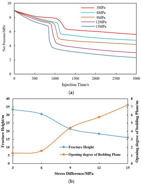 To further understand fracture geometry change during the whole fracturing process, the net pressure and fracture width were quantitatively analyzed. As indicated in Figure 4, it was found that net pressure showed a sharp decrease with the opening of the bedding plane. Compared to net pressure changes under five different scenarios, it was found that the net pressure showed a sharp decrease when the hydraulic fracture came across the bedding plane. It was also found that with the increase in the opening degree of the bedding plane, the net pressure also showed an obvious decrease. The fracture width decreased with the decrease in net pressure. Based on the simulation, it was concluded that the minimum horizontal principle stress difference was the predominant factor controlling fracture geometry. Under a high stress difference, when the stress difference was over 9.0 MPa, fracture propagation resistance showed a huge change during fracture propagation, and propagation resistance in the bedding plane was lower than that of the rock matrix, thus the opening degree of the bedding plane showed a great increase.
