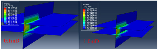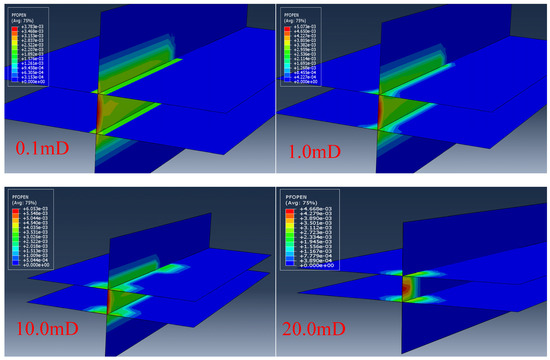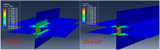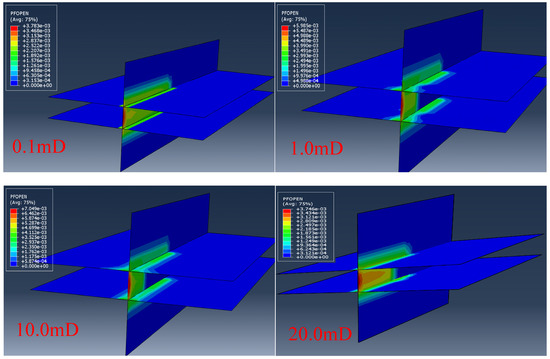For Group III, the experiment was conducted with a formation permeability of 0.1 mD, 1.0 mD, 10.0 mD and 20.0 mD and the viscosity of the fracturing fluid at 50.0 mPa.s. From the simulations, it was found that all hydraulic fractures crossed the bedding planes, and the opening degree of the bedding planes increased with the increase in formation permeability. When the formation permeability was 0.1 mD, 1.0 mD, and 10.0 mD, the opening degree of the bedding planes was 0.8 m, 1.4 m and 2.1 m, and the fracture height was 33.1 m, 28.7 m, and 24.6 m. When the formation permeability increased to 20.0 mD, it was found that the fracture height showed a dramatic decrease; when the fracture height was 18.7 m, the opening degree of the bedding plane increased to 4.6 m (Figure 7).