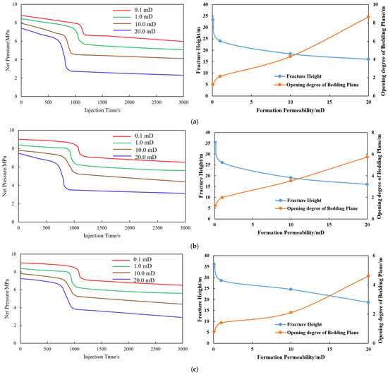 To further investigate the pressure change during hydraulic fracturing, the net pressure during fracture propagation was quantitatively analyzed. From Figure 8, it was found that the net pressure increased with the decrease in formation permeability, and decreased with the decrease in the viscosity of the fracturing fluid. The main reason was that a low formation permeability and high viscosity of the fracturing fluid can effectively reduce the seepage of the fracturing fluid from the fracture surface, thus more fracturing fluid can contribute to the propagation of hydraulic fracture. Under a high viscosity of the fracturing fluid and low formation permeability, the hydraulic fracture can cross the bedding plane easily, while it was arrested by the bedding plane under a low viscosity of the fracturing fluid and high formation permeability. It was also found that the net pressure showed a great decrease when the hydraulic fracture interacted with the bedding plane; the main reason was that with the increase in the opening degree of the bedding plane, more fracturing fluid flowed into the bedding plane, thus the net pressure of hydraulic fracture showed a huge decrease.