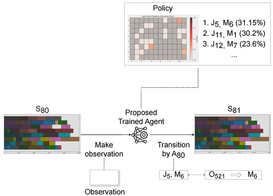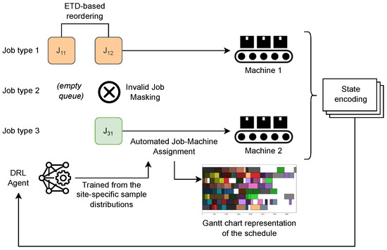 Once the encoded state representation is passed to the RL agent, it selects an optimal action which maps between a job instance and its compatible machine. The RL agent is trained over site-specific sample distribution, and thus, the decision can be further optimized for the assumed manufacturing factory. The proposed ETD-based reordering algorithm selects the most urgent job instance to process, and thus the agent does not need to suffer from the action space changes due to the varying number of instances of jobs. In addition, the action masking technique effectively disables invalid actions dynamically. Once the scheduling is complete, the proposed environment generates a Gant chart for better visualization of the scheduling results.