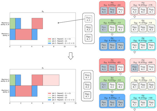 Let us assume that by the end of the previous timestep , is given higher priority than . In , Algorithm 2 computes and for and , respectively. The operation can be assigned to machine A and B, yielding . In the same manner, we obtain . Returning back to Algorithm 1, we obtain and . As a result, in is given higher priority than in . Among the three operations with higher priority in their respective pending job queues, it is assumed that the RL agent has assigned to machine 2, which makes a state transition from to as at the bottom of Figure 2. In , the ETD values of and are updated since is scheduled in . However, the ETD values of the jobs that are not scheduled in remain the same between and .