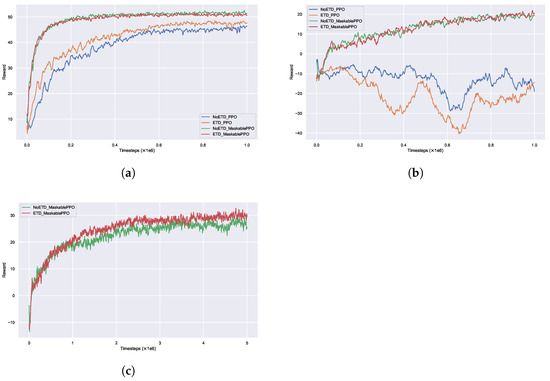 Another evaluation was conducted on the 12 × 8 scenario with the same training timespan of one million (Figure 5b) to examine the effect of ETD and action masking on a more complex problem instance. Given the complexity of this environment, PPO without action masking encountered frequent truncations (i.e., reward drops below a predefined threshold), validating the importance of masking. Up to the assumed timespan, the difference between ETD and NoETD within MaskablePPO configurations was not as substantial as before. To evaluate the performance difference caused by ETD after the convergence is achieved, another evaluation has been carried out for five million timesteps but without the methods that do not use action masking for their limited progress beyond one million timesteps (Figure 5c). Once the training surpasses one million timesteps, the impact of ETD becomes pronounced in terms of average reward. It confirms that ETD plays a critical role in scaling effectively to large, complex RJSP instances while enhancing the scheduling performance.