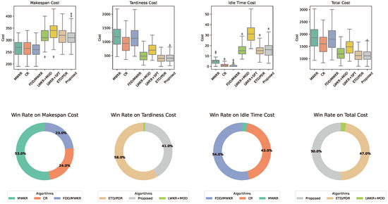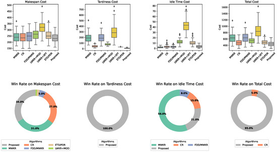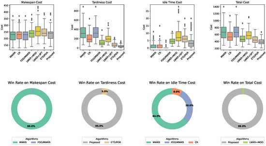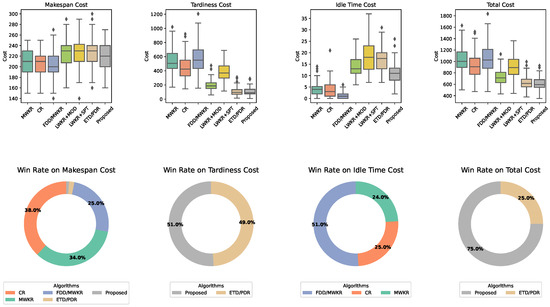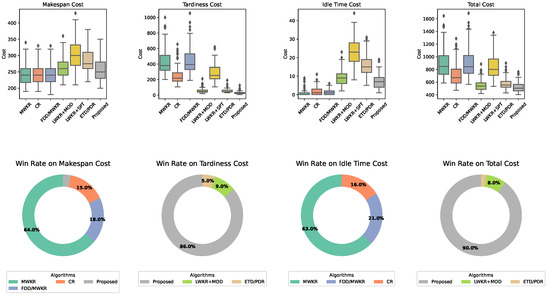 For large-sized scenario instances such as 10 × 8 (Figure 9) and 12 × 8 (Figure 10), the advantage of the proposed solution in terms of the total cost and tardiness is still obvious. The mean total cost of the proposed approach, ETD-based PDR, and the remaining methods is 877.03, 887.37, and 1268.20, respectively. In percentage terms, the proposed approach and ETD-based PDR enhance the total cost performance by 30.84% and 30.03%, respectively. It is worth noting that for the 12 × 8 scenario, ETD/PDR has outperformed the proposed solution with respect to the tardiness cost by 1.29%, amounting to 5.35. Although the performance enhancement ETD/PDR has made is negligible, it is clearly evident that the proposed ETD metric can play an important role in decreasing the violation of deadlines. For the 10 × 8 scenario instance, the proposed solution has shown promising performance in terms of the makespan cost. Compared to FDD/MWKR, which outperforms most, the performance loss of the proposed solution is only 16.5 or 7.52%. As the scenario becomes more complex, i.e., 12 × 8, the loss has become greater, amouting to 47.7 (15.33%). However, the performance gain over the tardiness cost has become greater, i.e., 746.8 or 64.37%, for which the proposed solution still outperforms FDD/MWKR in terms of the total cost.