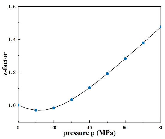 When the formation temperature is 130 °C and the formation pressure is 74 MPa, the corresponding relationship between the deviation factor z and the average reservoir pressure p is calculated according to Equation (3), as shown in Figure 3. When the average reservoir pressure p is 0–15 MPa, the deviation pressure z decreases with the increase of the average reservoir pressure p. When the average reservoir pressure p is greater than 15 MPa, the deviation pressure z increases with the increase of the average reservoir pressure p. When the pressure is between 74–35 MPa, the deviation pressure z ranges from 1.03 to 1.41.