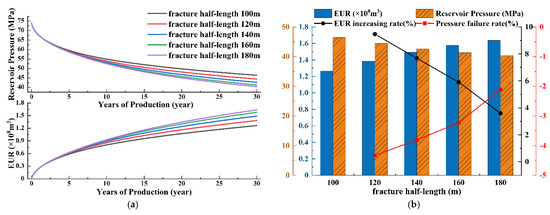 The impact of fracture half-length on reservoir average pressure EUR. (a) The relationship between fracture half-length and reservoir average pressure and EUR. (b) The increase rate of reservoir average pressure and EUR under different fracture half-length in 30 years of production.