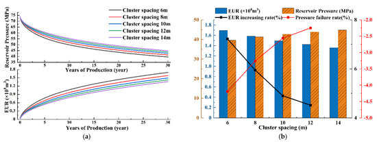 The impact of cluster spacing on reservoir average pressure and EUR. (a) The relationship between cluster spacing and reservoir average pressure and EUR. (b) The increase rate of reservoir average pressure and EUR under different cluster spacing in 30 years of production.