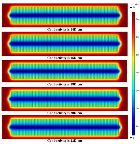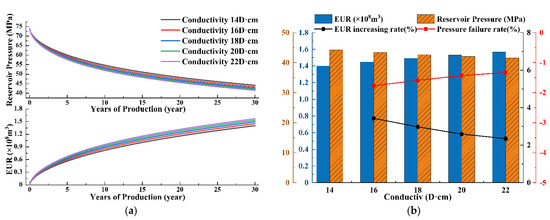 Set the fracture conductivity at 14 D·cm, 16 D·cm, 18 D·cm, 20 D·cm, and 22 D·cm while maintaining other model parameters constant. Simulate dynamic pressure failure during 30 years of production, with results presented in Figure 8. As depicted in Figure 9a, higher fracture conductivity corresponds to lower average reservoir pressure and greater EUR within the same production time. The increase in EUR is 2.8% for every 2 D·cm increment in inflow capacity, demonstrating a proportional enhancement rate of EUR. Elevated inflow capacity accelerates seepage between the matrix and fractures, allowing more shale gas to flow from the matrix to fractures, resulting in faster reservoir pressure relief within the same timeframe and consequently increasing EUR. The EUR growth curve exhibits gradual growth as fracture conductivity increases (Figure 9b). In conclusion, when designing inflow for actual production, opt for the largest possible fracture conductivity based on real field production conditions. The optimal fracture conductivity for this model is approximately 22 D·cm.