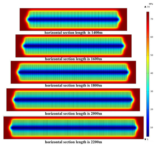 Design the horizontal section length as 1400 m, 1600 m, 1800 m, 2000 m, and 2200 m while keeping other model parameters constant. Simulate the dynamic pressure failure during 30 years of production, and the results are illustrated in Figure 10. The control reserves differ for various horizontal section lengths, calculated as 4.386 × 108 m3, 4.902 × 108 m3, 5.418 × 108 m3, 5.934 × 108 m3, and 6.45 × 108 m3, respectively. As depicted in Figure 11a, changes in horizontal section length have minimal impact on reservoir pressure decay, but EUR increases with longer horizontal sections. This is due to changes in total reserves. For each 200 m increase in horizontal section length, the EUR growth rate rises by 12.12% [8]. Figure 11b indicates that for the beneficial development of deep shale, the EUR of a single well should exceed 1.5 × 108 m3. When the horizontal section length reaches 1800 m, the EUR reaches about 1.5 × 108 m3, meeting the standard for beneficial development. In conclusion, once the cluster spacing reaches the threshold value in actual production, increasing the horizontal section length based on well area can enhance EUR. This model suggests a suitable horizontal section length exceeding 1800 m.