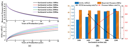 The impact of horizontal section length on reservoir average pressure EUR. (a) The relationship between horizontal section length and reservoir average pressure and EUR. (b) The increase rate of reservoir average pressure and EUR under different horizontal section length in 30 years of production.