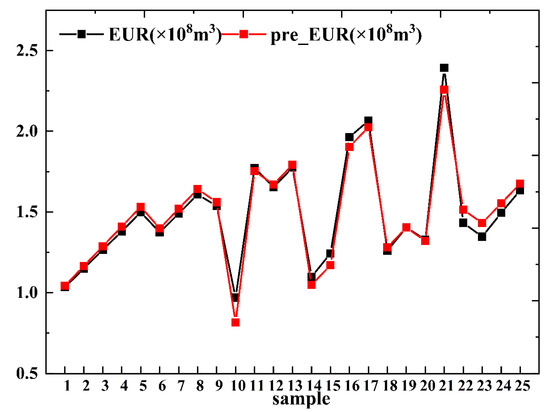 The specific calculation steps are as follows: the four factors in the test set are standardized using the Equation (15), after which the standardized results are substituted as variables into the regression equation (Equation (19)) involving X1, X2, X3 and X4. Finally, the predicted EUR is obtained.