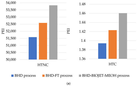 The analysis of potential environmental impacts (PEIs) of all BHD processes by normalization was performed using the ILCD 2011 software. The PEIs in the categories of human health and ecosystem are shown in Figure 17a,b, respectively. For the category of human health, the PEI of the BHD-BIOJET-MEOH process was the one that most contributed to HTNC, while the HTC was comparable among all processes. Regarding the category of the ecosystem, the PEIs in the categories of PCOP and AP were the two biggest impacts for all processes. And the BHD-BIOJET-MEOH process offered the highest effect on the ecosystem.