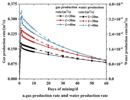 Figure 7 presents the changes in gas and water production rates over 60 days for different perforation interval lengths (20 m, 30 m, and 40 m), as well as cumulative gas and water production. As shown in Figure 7a, gas and water production rates rise rapidly at the beginning of extraction for each perforation length, then gradually decline over time, eventually stabilizing in a fluctuating state. Initially, as bottomhole depressurization begins, the hydrate system approaches its phase equilibrium boundary, causing equilibrium to destabilize. The resulting pressure gradient from the formation toward the wellbore becomes the main driver of hydrate decomposition. However, as hydrate decomposition progresses, pressure equalizes, reducing the gradient and causing a drop in the decomposition rate. Later in the extraction process, the pressure gradient between the hydrate-bearing formation and wellbore is insufficient to sustain hydrate decomposition, making formation heat the primary driver. Since heat transfer within the formation depends on its thermal properties, hydrate decomposition slows.