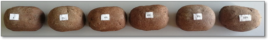 Statistical analysis was conducted using ANOVA with the STATISTICA 12.0 software (StatSoft, Cracow, Poland), followed by Tukey’s test to evaluate the significance of differences at a level of α = 0.05. The breads were baked from the same raw material in three repetitions. The research design was random—first, the breads were tested in the range from 0 to 20%, but above 10%, the changes in bread quality were very unfavorable, so the tests were finally carried out in the range up to 10%. All measurements were performed in triplicate, and means and standard deviations were calculated. Different outcomes are marked with different lower case letters (a, b, c, …) and upper case letters (A, B, C, …) where the influence of two factors was studied.