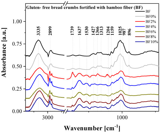 FTIR spectra of the gluten-free breadcrumbs with bamboo fiber (BF).