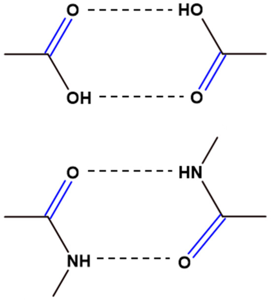In the context of the relevant type of food samples, the bands occurring from 1151 cm−1 to ca. 900 cm−1 and related to the stretching vibrations of C-O and C-C groups in the C-O-C system are particularly interesting. The stability of the bands’ intensity indicates that the level of the samples’ crystallinity remained largely unchanged. It is noteworthy that the maximum at 1151 cm−1 was shifted by 10 cm−1 towards higher frequencies in the samples containing pure bamboo fiber. The vibrations around 895 cm−1 are also significant, as they correspond to the vibrations of sugar fractions forming the cellular walls of bamboo, i.e., cellulose, hemicellulose, pectin, and aromatic lignin polymers [32,37,38,39]. One should also underline that all the mentioned types of vibrations originated from the primary components of our samples, including cellulose formed through the merging of the linear chains of aldehyde sugars. The hydrogen bonds present in the cellulose structure allowed for the formation of ordered crystalline areas, while random hydrogen bonds led to the formation of amorphous structures (an example of the strong hydrogen bond mechanism is presented in Scheme 1).