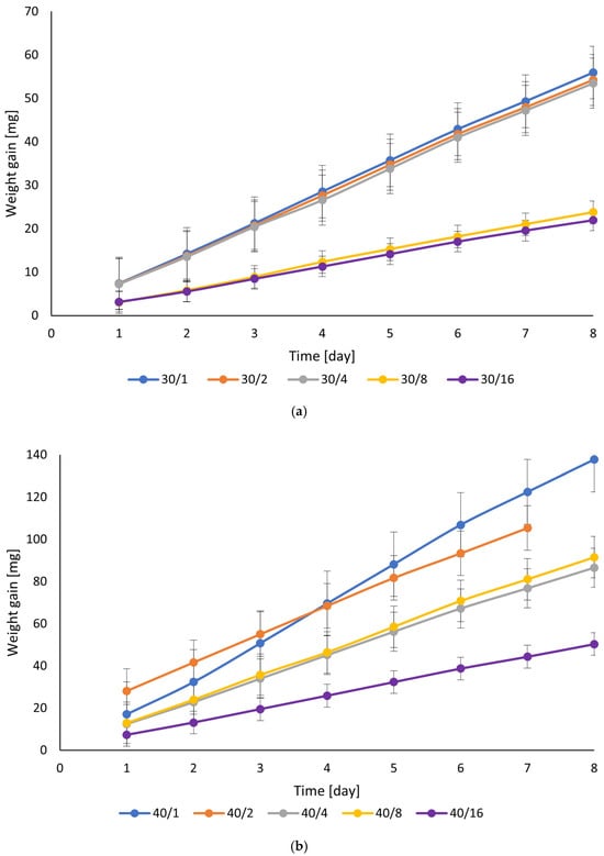 (a) Weight gain of films with 30% glycerol with 1–16 h UV irradiation intervals for vapor permeability measurements. (b) Weight gain of films with 40% glycerol with 1–16 h UV irradiation intervals for vapor permeability measurements.