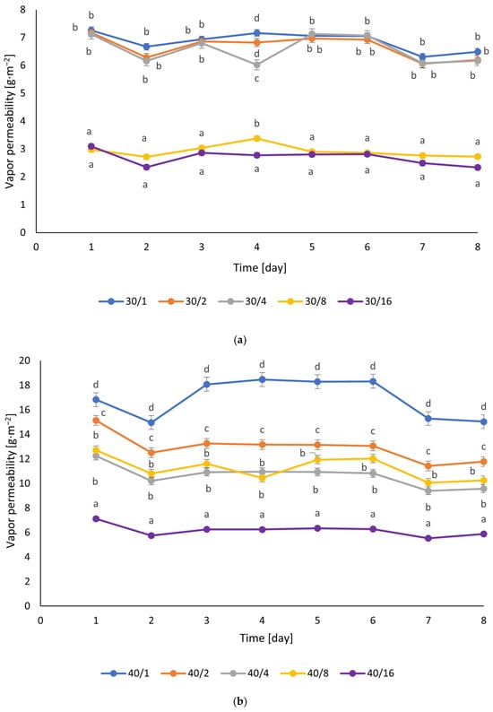 (a) Water vapor permeability of films containing 30% glycerol after 1–16 h of UV irradiation. According to Tukey’s test, different letters indicate significant differences (p < 0.05) between samples. (b) Water vapor permeability of films containing 40% glycerol after 1–16 h of UV irradiation. According to Tukey’s test, different letters indicate significant differences (p < 0.05) between samples.