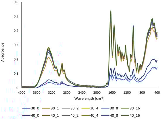 Vibrational characterization of functional groups of gelatin films containing 30% and 40% glycerol after UV irradiation at 0–16 h intervals.