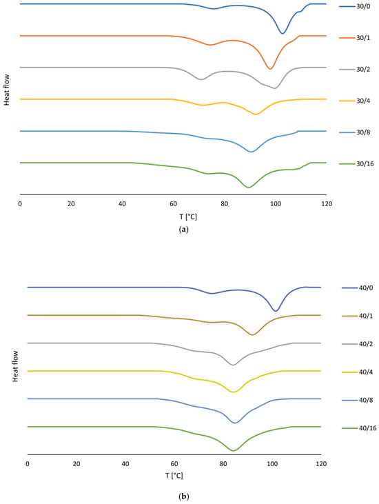 The heating of samples with 30% and 40% glycerol is shown in Figure 4a,b. Two critical transitions can be seen here: the glass transition temperature, characterized by a change in baseline position (change in heat capacity); and in this case, endothermic recovery (glass transition and relaxation). Tg is followed by an endothermic peak corresponding to the spiral structure’s melting temperature.