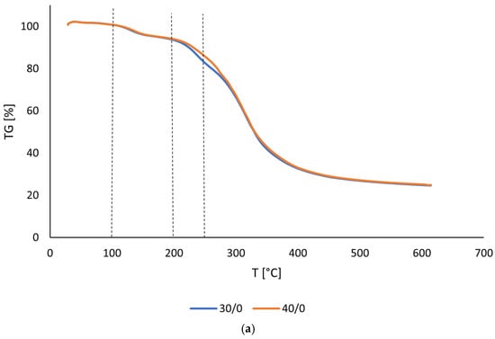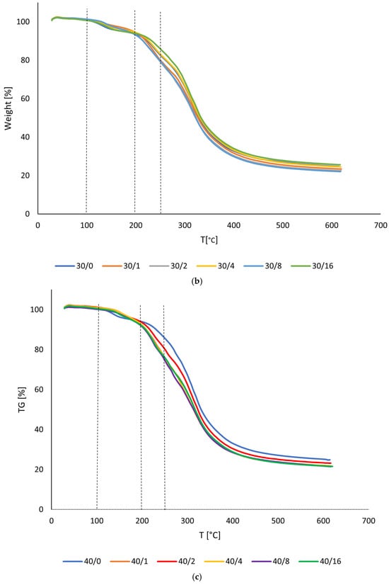 When comparing the samples before and after irradiation, the curves of the 30% and 40% samples (Figure 5b,c) after irradiation show a very similar pattern to the non-irradiated ones. Again, three stages of decline can be observed around the same temperatures, with a comparable course for all tested samples.