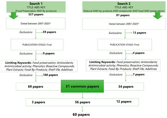 Article selection processes of the two keywords used (Food preservation AND by-products; Natural AND By-Products AND food AND preservation AND Compounds) (* Article issued in volume dated 2025).