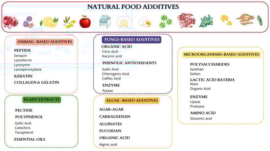A natural additive is identified as a substance extracted from biological sources such as plants, animals, or microorganisms, used to improve the quality, preservation, appearance, or taste of food [45]. Unlike synthetic additives, natural additives are not produced artificially through synthetic chemical processes but are obtained through natural methods such as extraction, fermentation, or purification [26]. The types of natural additives include several categories of compounds, each with specific functions and applications in the food industry (Figure 3). The most important are the following:
