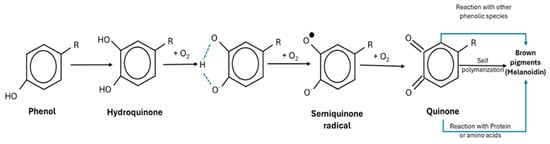 The main causes of chemical changes in polyphenols during food preservation mainly depend on physico-chemical factors related to food preservation, such as temperature, pH, light, and oxygen, as well as the presence of endogenous enzymes in the food matrix. The main reaction affecting polyphenols during storage is oxidation. This takes place in the presence of oxygen, high temperature, and light, and can be accelerated by enzymes (e.g., polyphenol oxidase or PPO), or by catalysts such as metals (e.g., iron and copper), which are often present in traces in food [56]. Therefore, two types of polyphenol oxidation can take place within the food: enzymatic and non-enzymatic. The first reaction involves PPO, which catalyzes the oxidation of the hydroxyl groups (-OH) of polyphenols, transforming them into quinones. These compounds are highly unstable and can further react with each other or with other molecules, leading to the formation of polymeric compounds or dark pigments (such as melanoidins) (quinone polymerization) (Figure 5) [57]. Another reaction that can occur with polyphenols during food preservation is the hydrolysis of glucose into glycosylated polyphenols. This reaction is accelerated during the food preservation process by low pH and the presence of enzymes. Another reaction involving these compounds is the Maillard reaction, favored by high temperatures and neutral or slightly basic pH [58]. A further reaction involving these compounds is photochemical degradation (photooxidation); this reaction occurs in the presence of light as polyphenols absorb UV radiation, causing chemical breaks within the molecule or changes in structure, with a significant reduction in antioxidant capacity [59].