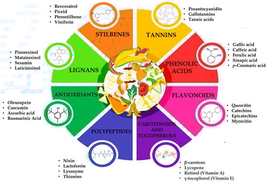 Figure 6 includes the main natural compounds extracted from food by-products and applied as natural additives, thus distinguishing among eight main bioactive components: tannins, stilbenes, lignans, flavonoids, antioxidants, polypeptides, carotenoids, and tocopherols [66].