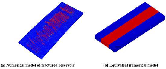 The numerical model of the fractured reservoir and the corresponding equivalent change model were constructed (Figure 5). The matrix permeability was 30 mD, the fracture opening was 0.1 mm, and the fracture linear density was 5 fractures/m. The equivalent permeability was calculated according to the fracture distribution range, and the corresponding numerical model was also constructed.