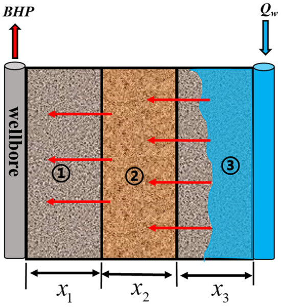 In Equation (21), xj denotes the length of each sector, where j = 1, 2, 3, W represents the model width in meters, and h signifies the model thickness in meters. Φji indicates the initial porosity of each region in percentage, and refers to the fluid saturation at the current time step for each region. The symbol Bij represents the fluid formation volume factor under current pressure conditions for each region. The terms , , and correspond to cumulative production from near-wellbore to wellbore, equivalent fracture zone to near-wellbore, and remote zone to equivalent fracture zone at the previous time step, respectively. is the average pressure of each region at the current time step, Pw1 denotes the wellbore pressure in MPa, qwinj represents injection terms, and ∆t is time, measured in days.